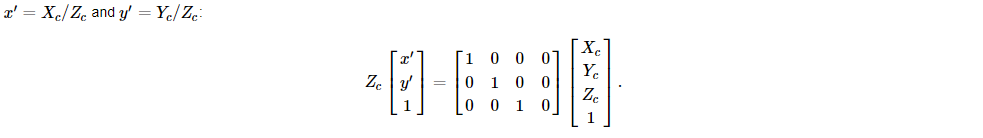 회전-이동 행렬 [ R | t ]는 투영변환(projective transformation)과 동차변환(homogeneous transformation)의 행렬곱입니다. 3x4 투영변환(projective transformation) 카메라 좌표로 표시된 3D포인트들을 이미지 평면의 2D포인트들로 맵핑하고, 정규화된 카메라 좌표로 표시합니다.