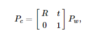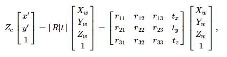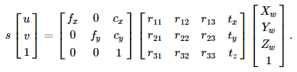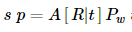 여기서 Pw 는 월드좌표계(world coordinate system)에 대해 표현된 하나의 3D포인트 이고, p는 이미지평면의 하나의 2D 픽셀, A는 카메라 내부행렬(Intrinsic matrix), R와 t는 월드에서 카메라 좌표계(camera coordinate system, or camera frame)로의 좌표 변경을 설명하는 회전(rotation)과 이동(translation)이고, s는 투영 변환의 임의의 스케일링이며 카메라 모델이고 카메라 모델의 일부는 아닙니다.