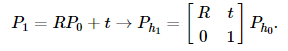 이 동차변환은 3x3회전 행렬과 3x1 이동 벡터 t로 구성됩니다.