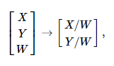 역 맵핑 Ph->P의 경우, 동차벡터(homogeneous vector)의 모든 요소(elements)를 마지막 요소로 나눕니다. 예를들어 3D동차벡터의 경우 2D 카르테시안 대응을 다음과 같이 얻습니다. W는 0이 아니어야 합니다.