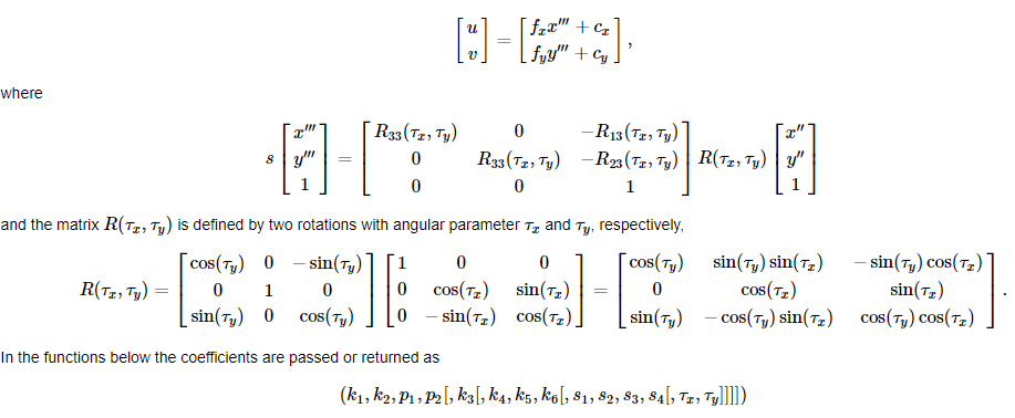 왜곡 매개변수(distortion parameters)는 방사계수(radial coefficients) k1, k2, k3, k4, k5, k6이고, p1와 p2는 접선왜곡 계수(tangential distortion coefficients)이고, s1, s2, s3, s4 든 얇은 프리즘 왜곡 계수(thin prism distortion coefficients)입니다. Higher-order는 OpenCV에서 고려되지 않습니다.