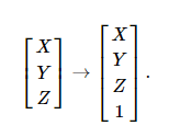 n-차원 카르테시안 벡터(cartesian vector) P를 따라 1을 덧붙여서 동차벡터(homogeneous vector) Ph를 얻습니다. 예를들어, P->Ph로 맵핑하는 3D 카르테시안 벡터(cartesian vector)는 다음과 같습니다.